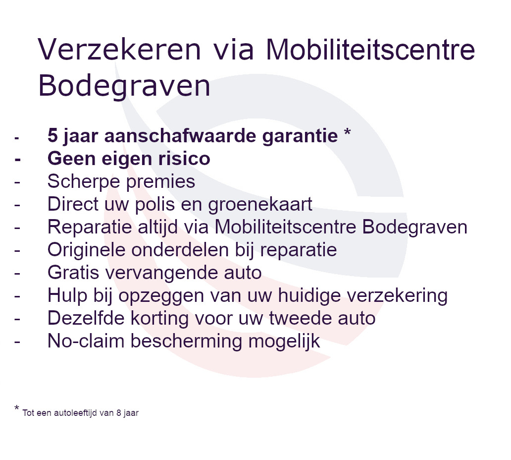 Afleverpakket PERFECT € 995: 12 maanden BOVAG garantie, Onderhoud bij naar fabrieksschema bij aflevering, Minimaal één jaar APK, Professionele reconditionering van in- en exterieur inclusief polijsten, Vervangen van slijtagegevoelige onderdelen bij aflevering die binnen 10.000 KM en/of 6 maanden aan vervanging toe zijn, 1 jaar Mobiliteitsservice met woonplaats en Europadekking, 1 jaar gratis vervangen van lampjes (Exl. Interieur- en ledverlichting), repareren van lekke band, vullen van olie en van ruiten- koelvloeistof wanneer dat nodig is, Gratis tussentijdse aircocheck, zomercheck en wintercheck, Volle tank
